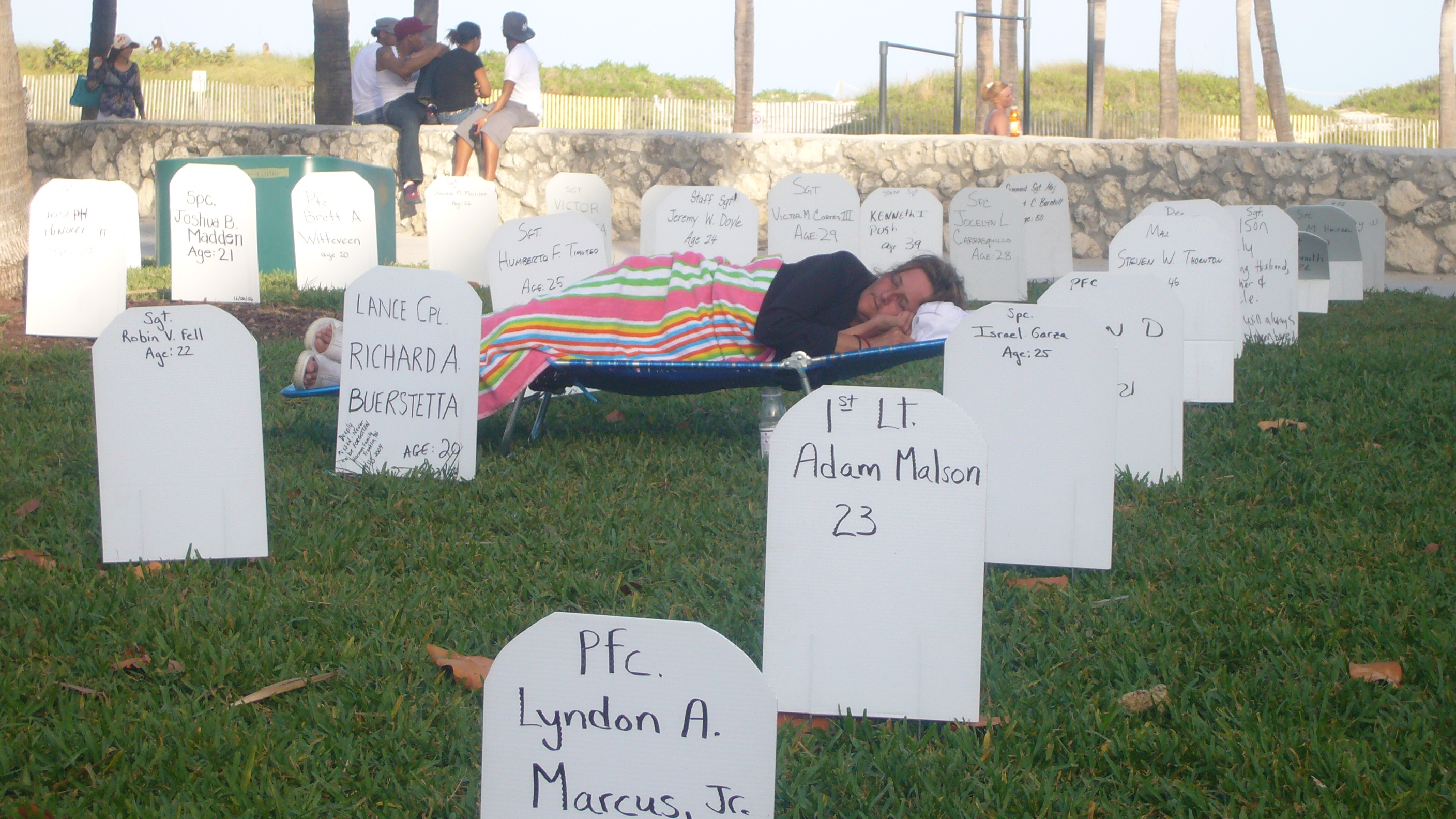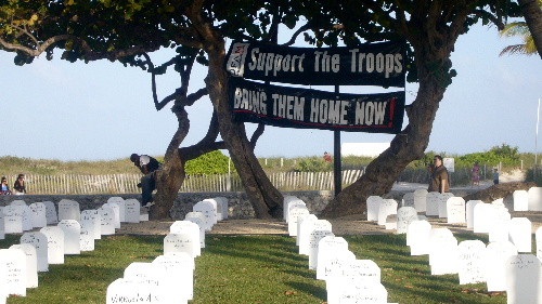 Над кладбищем картонных и деревянных надгробий реет американский флаг и черный транспарант со словами: «Поддержите наших солдат-верните их домой!»