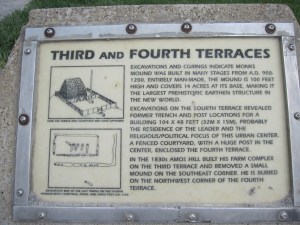 Иллинойская Кахокия-это серия  из 120 земляных  курганов,  расположеных на самой  большой в мире рукотворной площади -6 квадратных миль (15.5 кв. км), недалеко от города Сент-Луис. Самая  большая  земляная конструкция на обоих американских континентах  —  Монашеский курган (Monks mound),- признана мировым  достоянием  и имеет 30 метров в высоту (высота 10-ти этажного дома)  и 255 метров в длину. Монашеский курган был построен во времена расцвета миссиссипийской культуры (650-1350 гг. нашей эры)-скорее всего около 1050 года, а своё название он получил от поселения французских монахов, которые основались в этом районе в 19 веке. Курган построен в форме прямоугольной пирамиды, обращённой на юг, с 4-мя уровнями- террасами.  Площадь основания его  больше  чем  у  пирамиды  Хеопса, но в отличие от египетских пирамид, для  постройки  кургана было использовано около 25 млн. кубометров земли, которую  строители  переносили  в  плетёных  корзинах. Согласно одной из версий, это четырёхъярусное сооружение, вероятно, служило основанием для храма, высота которого могла составлять 15 метров, что делало его видимым изо всех уголков поселения.