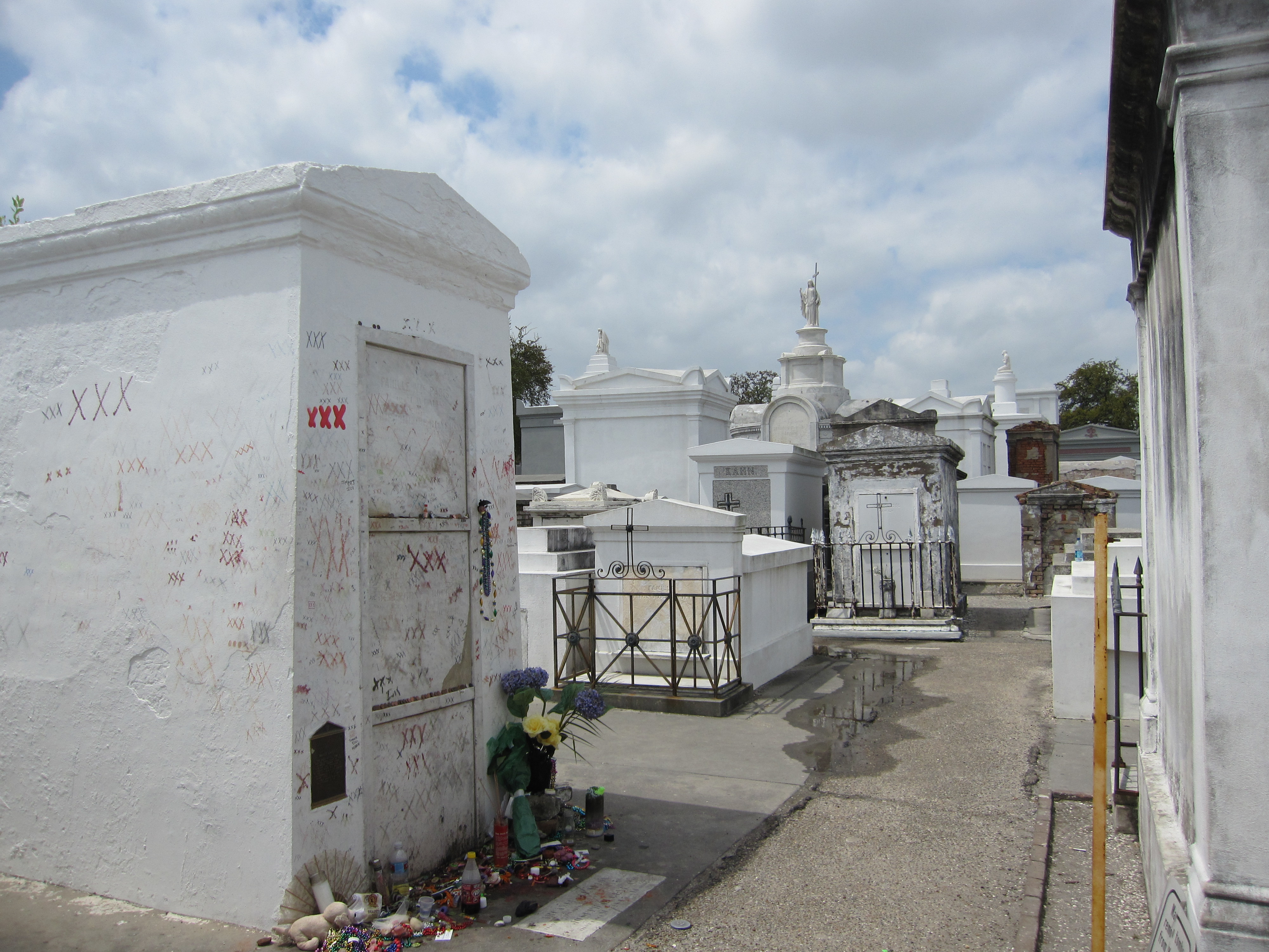 Новый Орлеанс расположен ниже уровня моря и с давних времен усопших, чтобы они не всплывали, замуровывают или в надземные склепы, или в подземные каменные комнаты-нишы. Но ураган Катрина сумел потревожить сон некоторых усопших, отправив их во второй раз в «последний путь» по улицам древнего Орлеанса 6 лет тому назад, свидетельство чему некоторые начисто разрушенные склепы и потрепанные дома со следами укуса стихии. У подножия других разбросаны разноцветные предметы: от свежих и засушеных цветов-до кукл и красных крестиков, нарисованых у подножия склепа цветным мелом. Дело в том, что в Новом Орлеансе и по сей день верят в привидения, подкрепленные распространенной здесь религией Вуду, которая крепко прижилась среди потомков чернокожих рабов, завезенных в США из Африки. Это верование отличается от других множеством ритуалов, жертвоприношений, талисманов, танцами и музыкой, а также своеобразным колдовством с использованием специальных кукол. Они верят, что через куклы можно не только повлиять на поведение и поступки живых людей, но и передать послание усопшим.