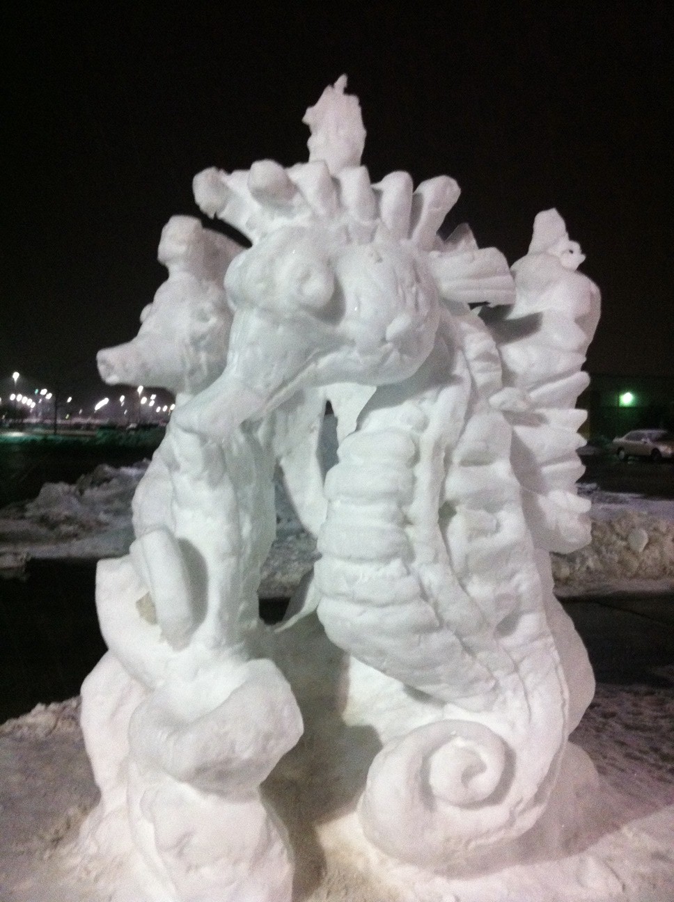 Морские коники в недоумении смотрят на проезжающие машины и влюбленные пары, которые то и дело пытаются снять фотографию на память в объятиях снежного мира. И только странная белая пара все кружится в танце, невзирая на местных аборигенов и другое течение времени.