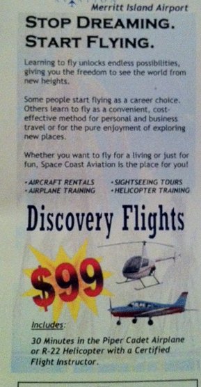 В 11:45 утра мы подъехали к стоянке муниципального аэропорта города Мэрит Айленд, штат Флорида. Стоимость полу-часового учебного полёта на одно-моторном самолёте Сесна-$99, в который уже включены стоимость обучения, работа инструктора, расход бензина, и даже присутствие пассажира-«не ученика» в салоне самолёта (в даном случае-моего мужа Сергея).