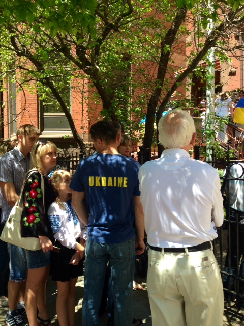 Чимало людей у вишиванках і в св»ятковому піднесенні духу. І навіть поліцейські, котрі від самого ранку забезпечують мирний перебіг виборів, здається вже усвоїли головні дві фрази дня, котрі то тут-то там звучать з уст українців: «Слава Україні! Героям Слава!»
